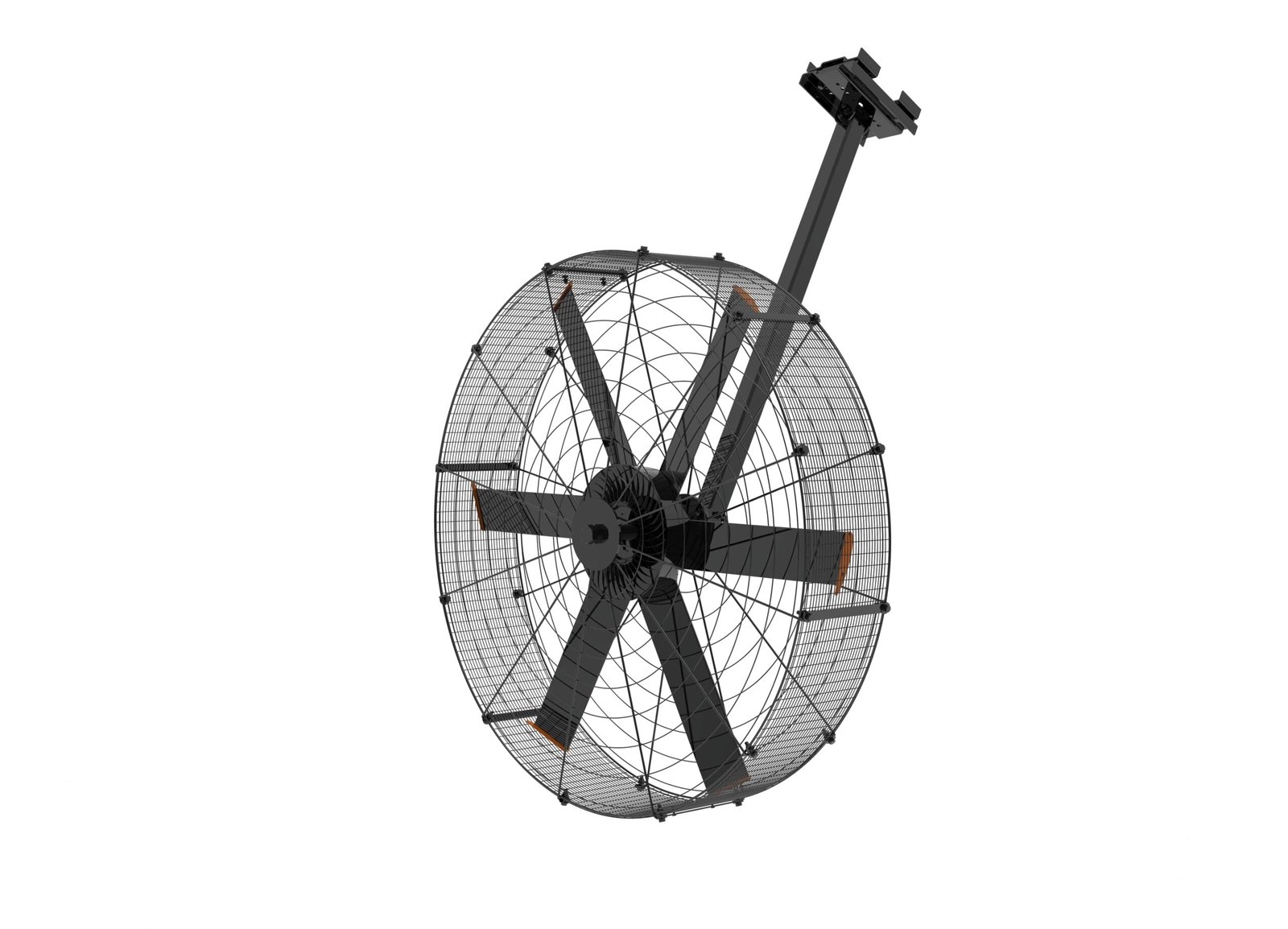 The 4′ 3” Industrial Fan is built with aircraft-grade aluminum blades and aerodynamic wingtips for efficient, powerful airflow with low energy use. It features a high-torque, high-efficiency, maintenance-free permanent magnet synchronous motor (PMSM). Housed in an OSHA-compliant steel cage and equipped with heavy-duty mounting hardware, this fan can be installed on concrete walls, ceilings, beams, columns, square tubes, and more. Designed and manufactured in-house, it also supports enhanced indoor environmental quality according to ASHRAE 55 standards.