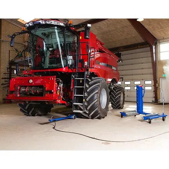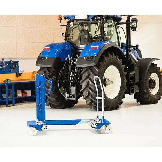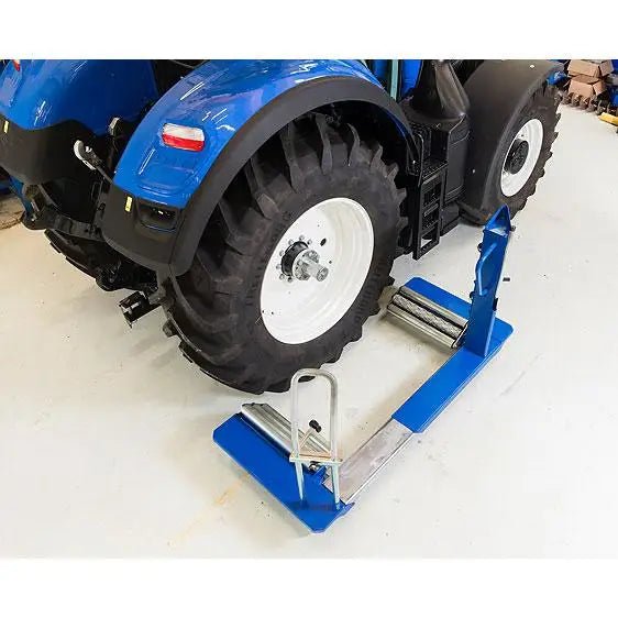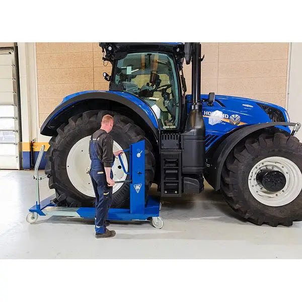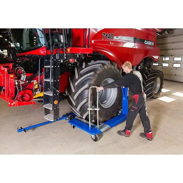 The AC Hydraulic wheel trolley is the best way to remove and transport agricultural and construction tires. The WT1500NT can easily handle the largest wheels and is designed to safely move them around the workshop. The new WT1500NT-B now comes with caster wheels and a brake, making it a truly one-person operation. The waist-high hydraulic pump handle moves the jaws in and out to accept different size wheels and is also used to raise or lower the wheel. A ratchet strap secures the unbolted wheel in place to give maximum safety, and also allows good access to the wheel nuts for more efficient working.