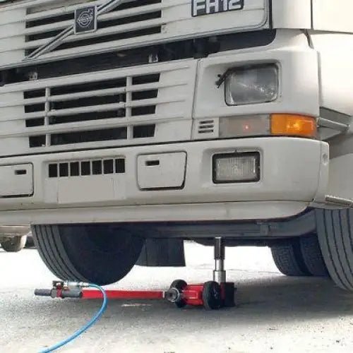 Air hydraulic jack for heavy vehicles, practical and easy to handle. The pistons move back automatically; the two descent valves guarantee perfect holding in all situations and controlled speed under load.